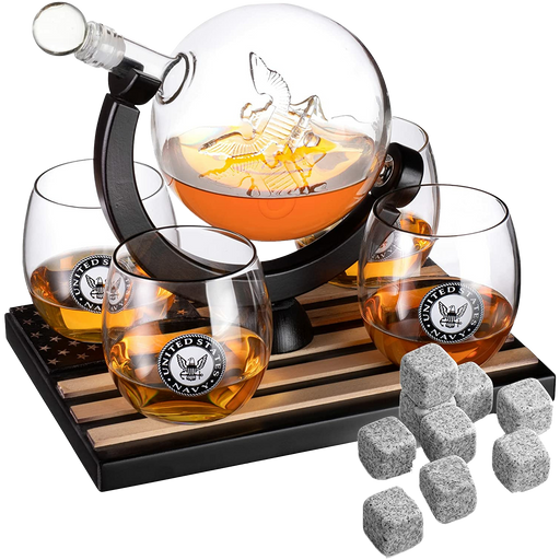 WHISKEY DECANTER GIFT SET - Our masterpiece gift set features a globe whisky decanter, mahogany stain base, four 12 oz glasses, and 9 whiskey ston...