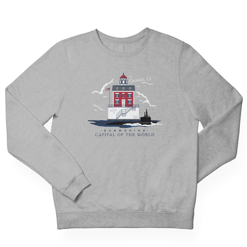 Soft, vintage print featuring a submarine passing Ledge Lighthouse on the Thames river in the Submarine Capital of the World- Groton, Connecticut.