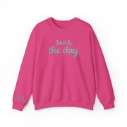 Seas every day! Aqua thread with embroidered sun with ocean wave on sleeve.